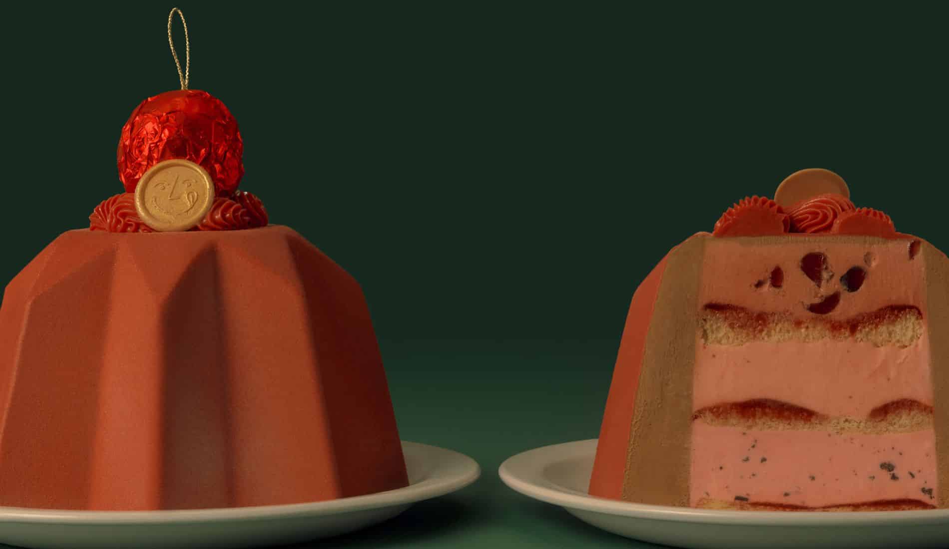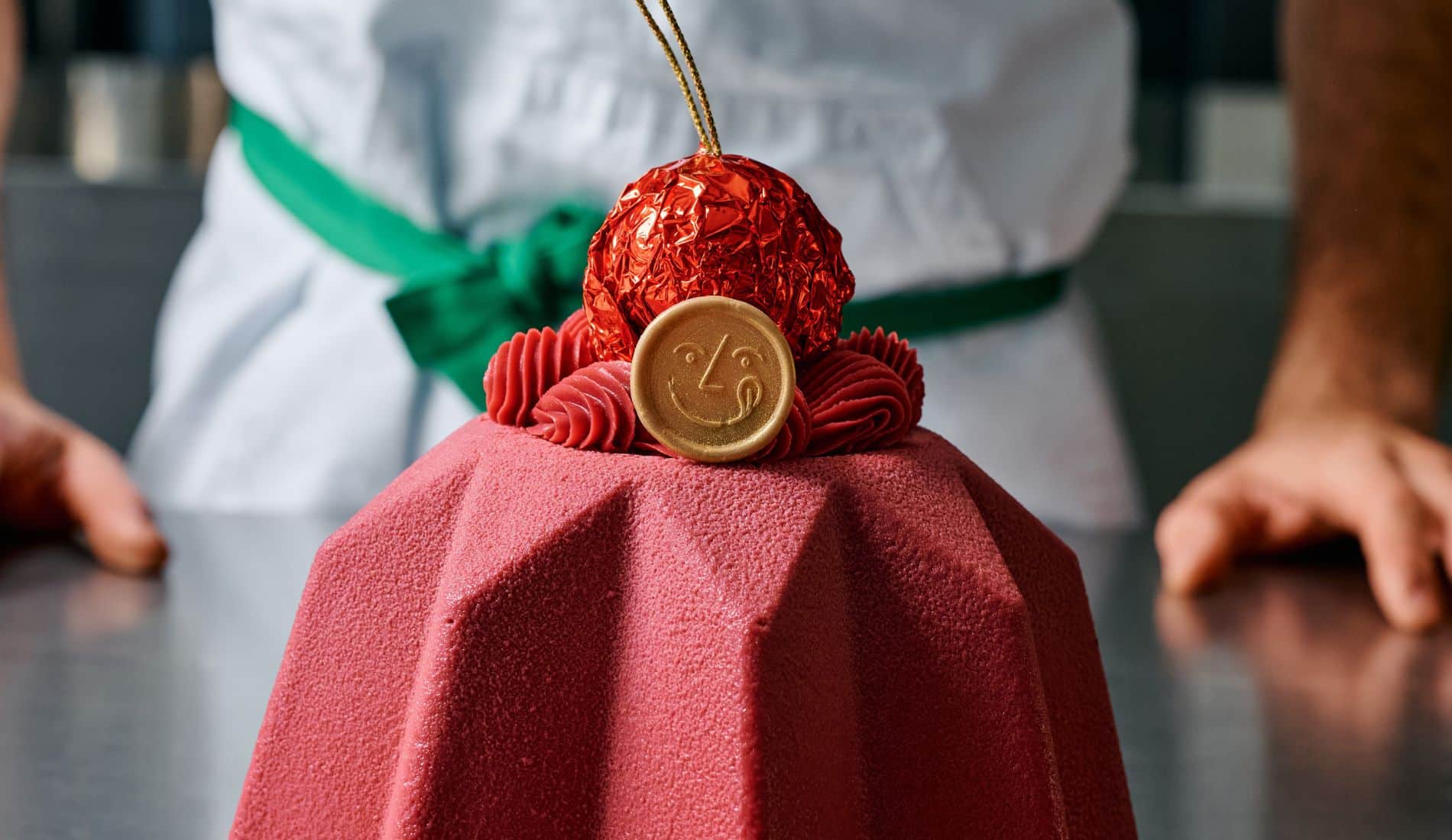 Our Pandoro Christmas Cake is back with a new look and flavour profile. Naturally coloured with a raspberry chocolate spray and crowned with raspberry ganache, the cake is finished with an edible handmade Milk Chocolate Bauble designed to be removed and hung from the Christmas tree as a decorative ornament. Inside, layers of rich chocolate semifreddo, cherry cream and sour cherry gelato, redcurrant jam, Italian pandoro cake, strawberry and cream gelato and redcurrant stracciatella gelato come together to create a nostalgic yet elevated festive dessert that serves 12 to 15 people.