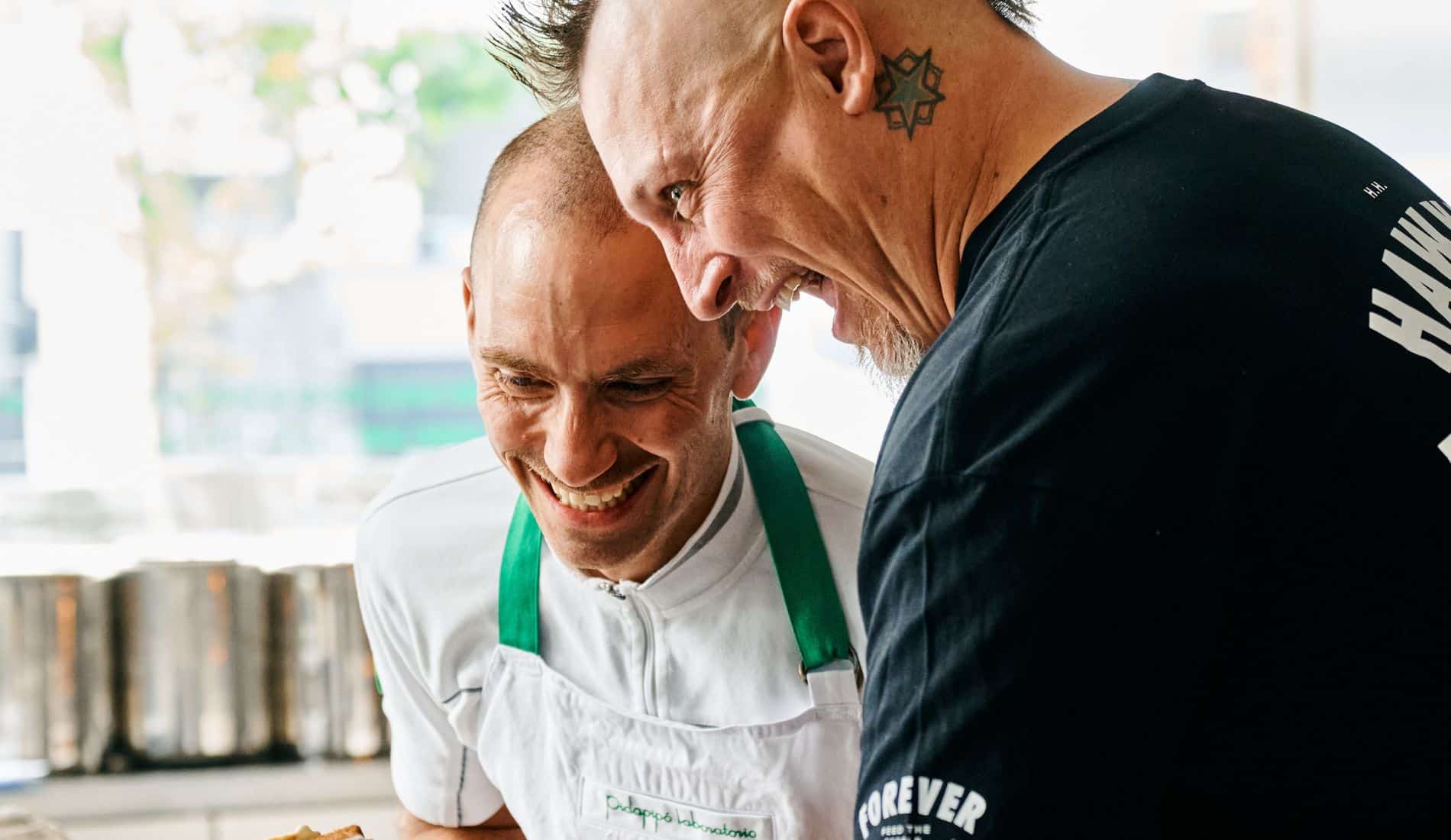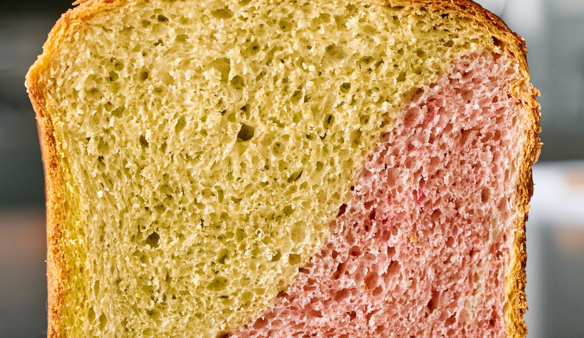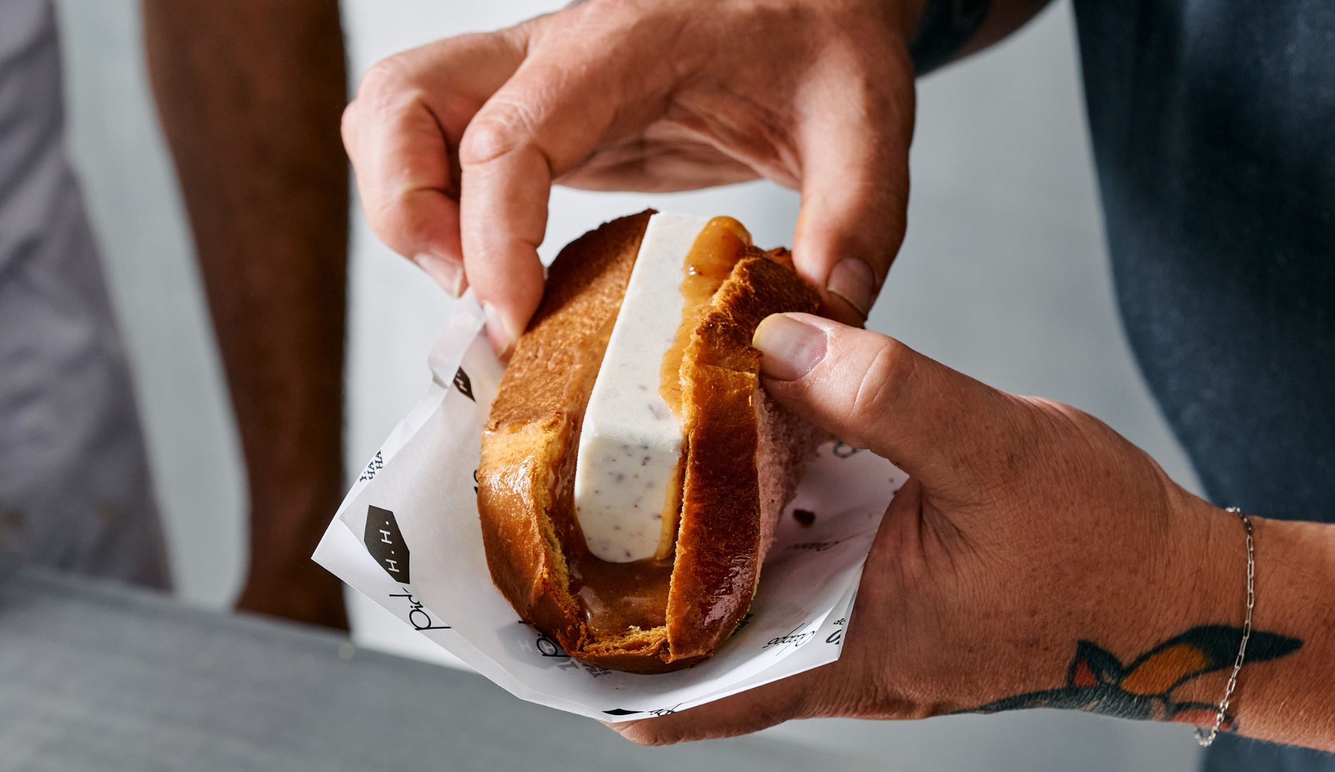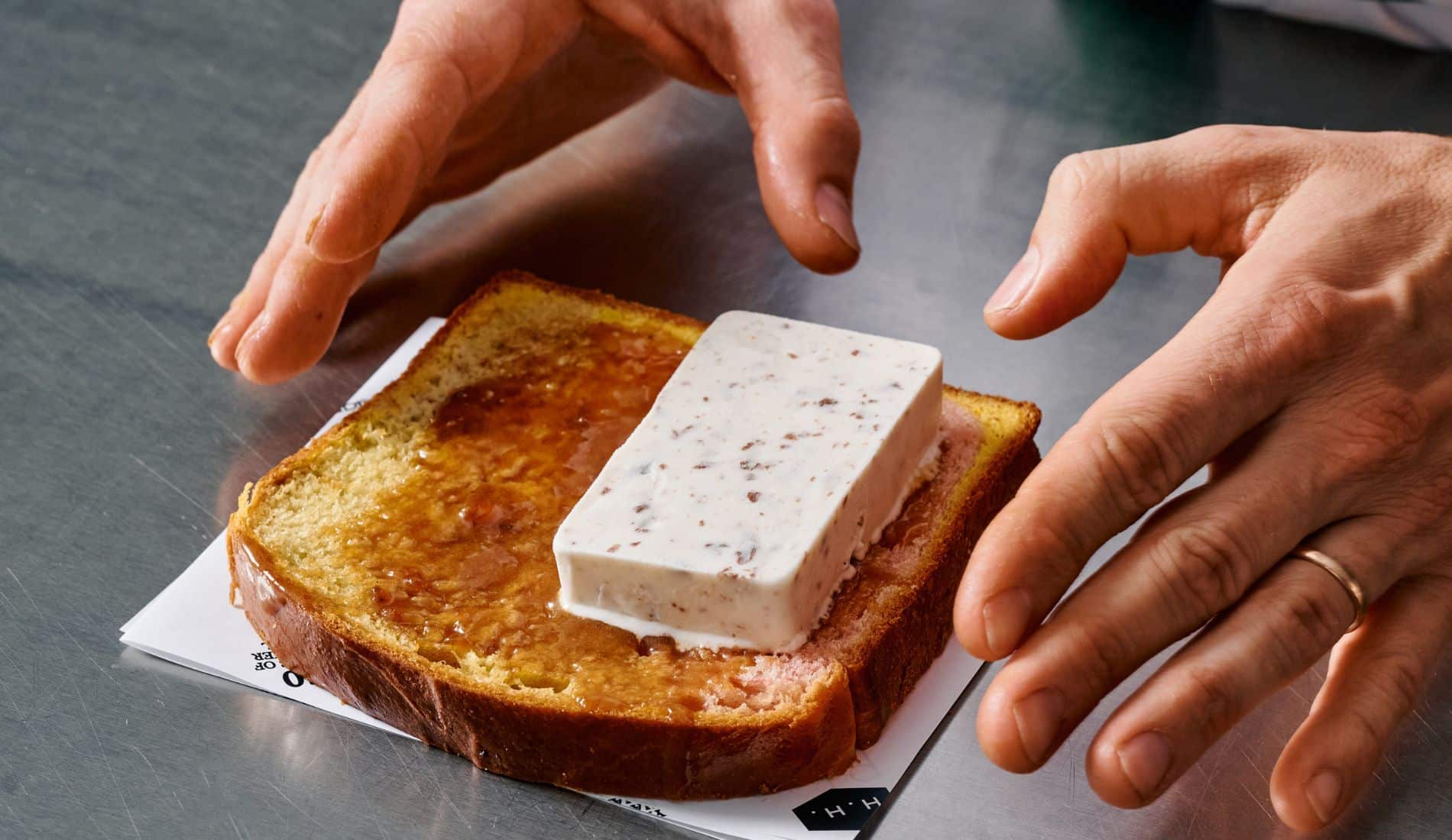 A popular street snack in Singapore, ice cream blocks are served between slices of soft bread. Our version features Coconut & Milk Chocolate Stracciatella gelato inside sweet, pillowy bread naturally coloured with homemade pandan extract (green), turmeric (orange) and radish, apple and blackcurrant (pink). It’s finished with house-made banana jam palm sugar coconut cream caramel kaya.