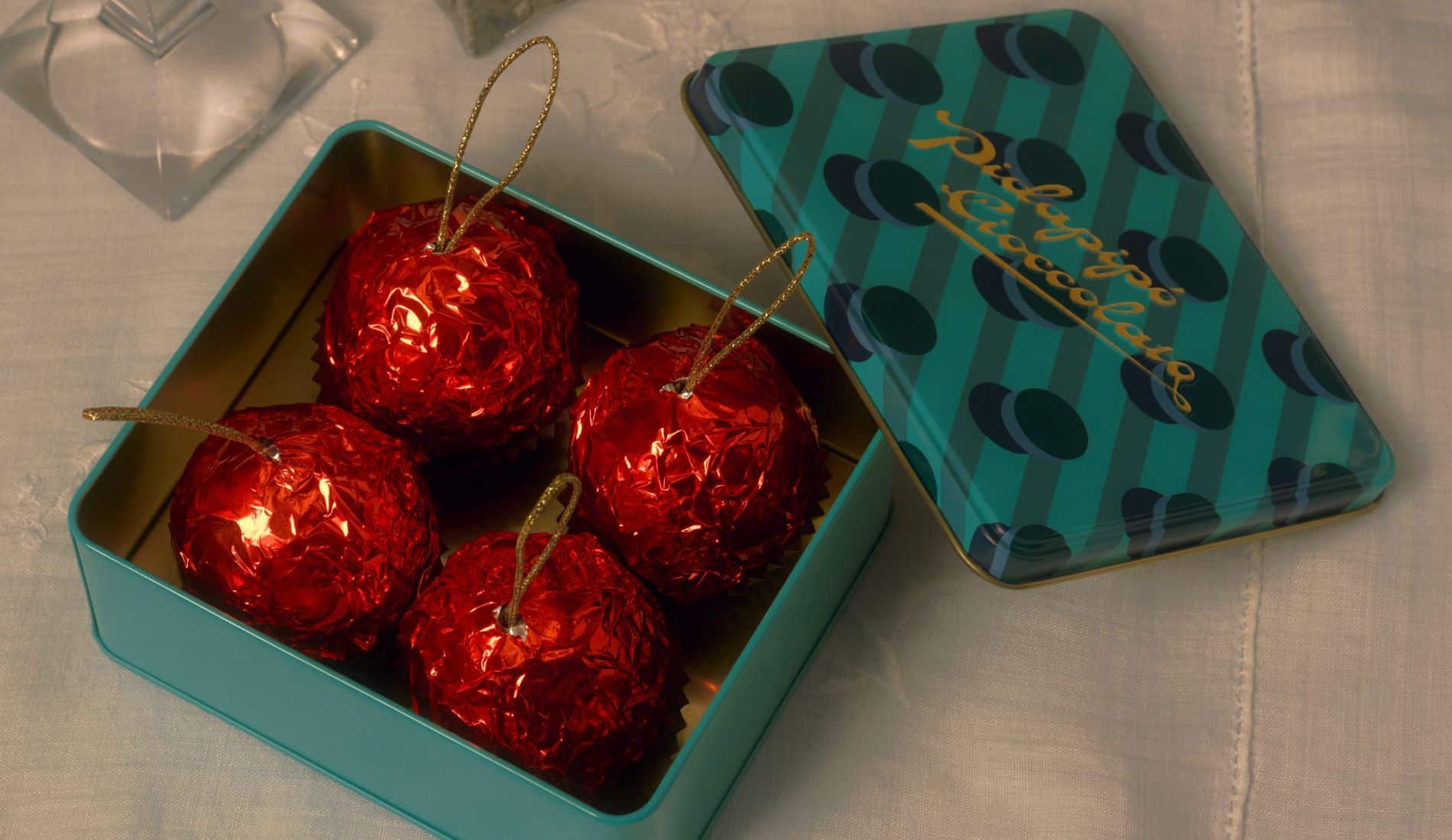 Pandoro cake. Handmade in small batches at the Fitzroy Laboratorio using single-origin Dominican Republic milk chocolate, each bauble is wrapped in red foil and presented in a keepsake tin lined with tissue paper and a Pidapipo card. The baubles can be hung from the Christmas tree making them the perfect festive gift or edible decoration.